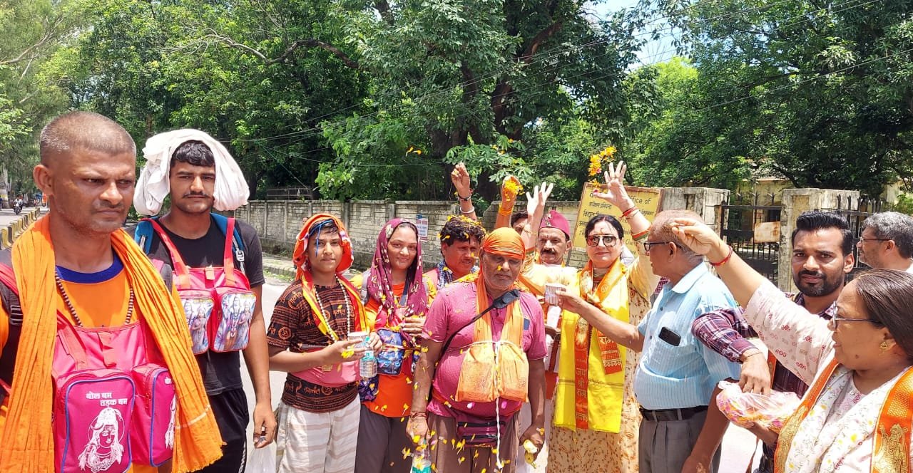 अपने गंतव्य की ओर कदम बढ़ा रहे शिवभक्तो पर भाजपा महिला नेत्री ने की पुष्प वर्षा